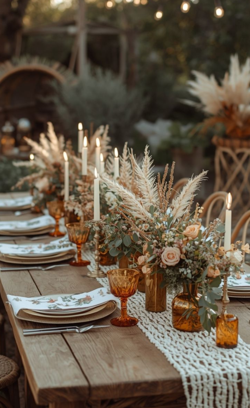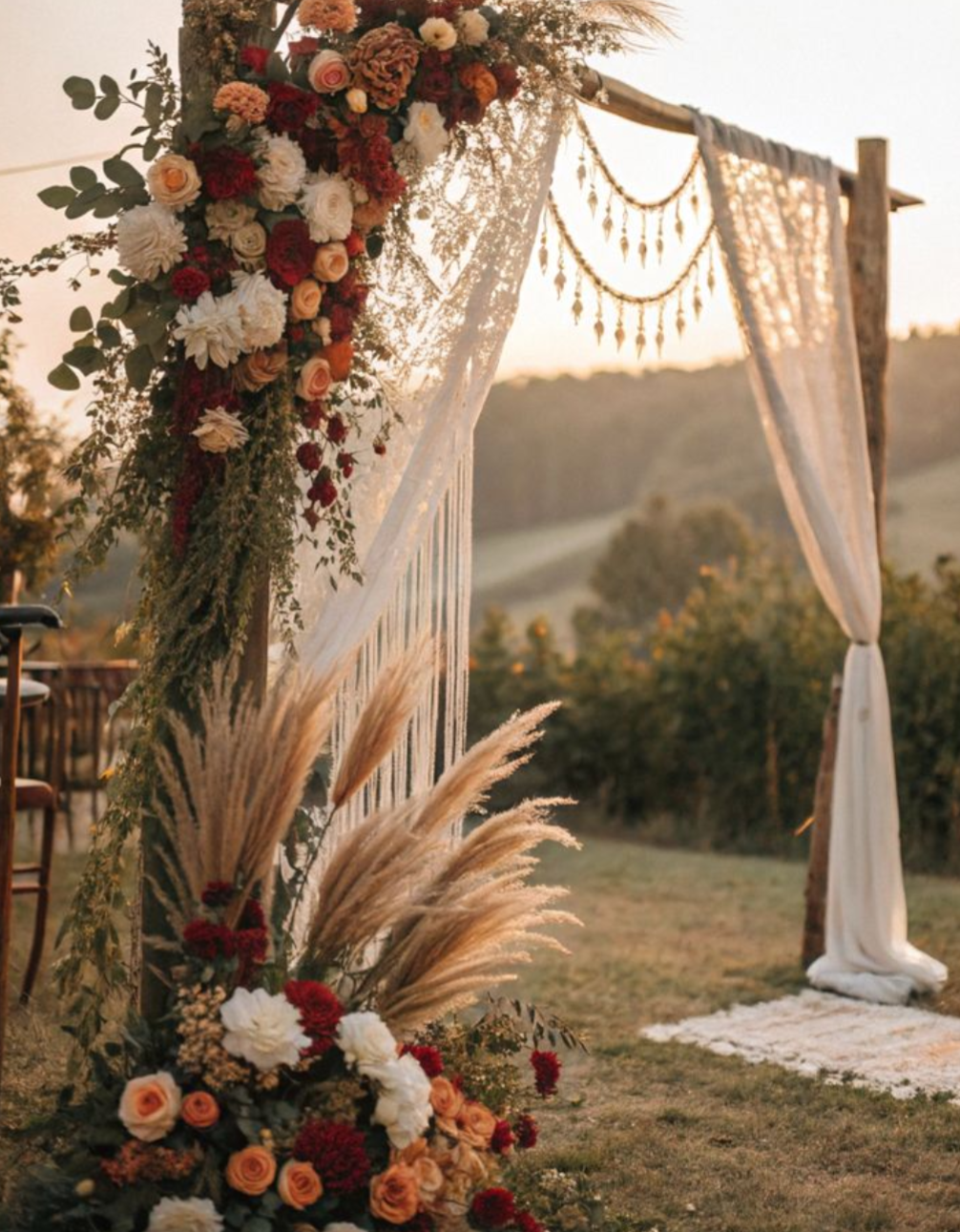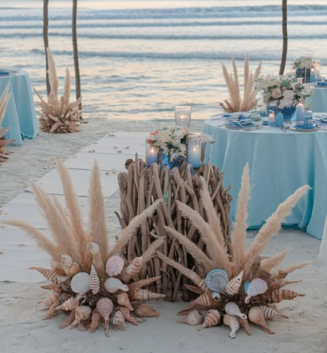 Boho babe meets coastal breeze, she's natural, were talking pampas grass, wicker pots, beige and cream base, light and airy, lanterns, sunset vibes. Milk churns, pots, gold tones all look great with this theme