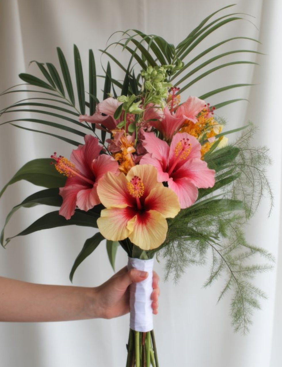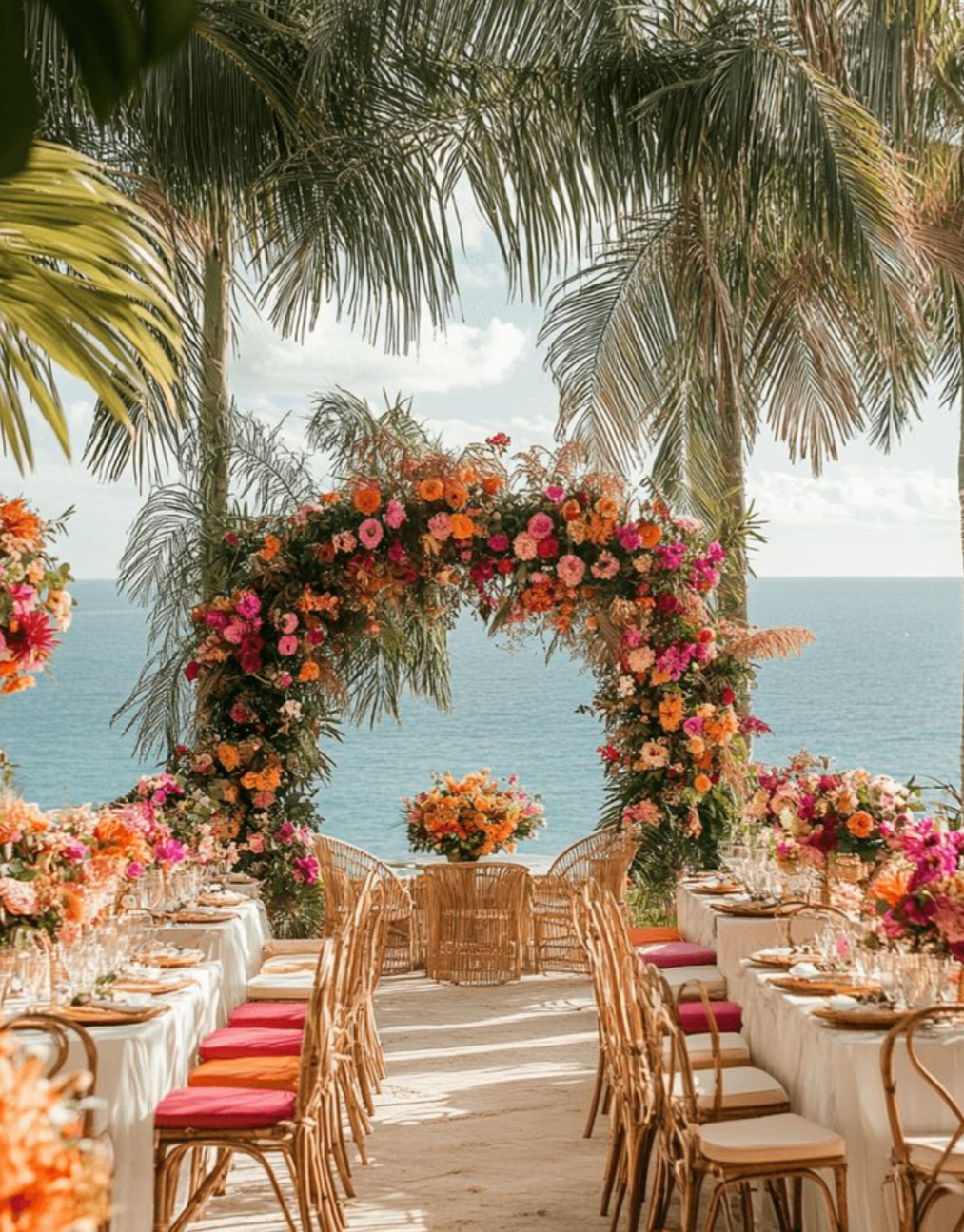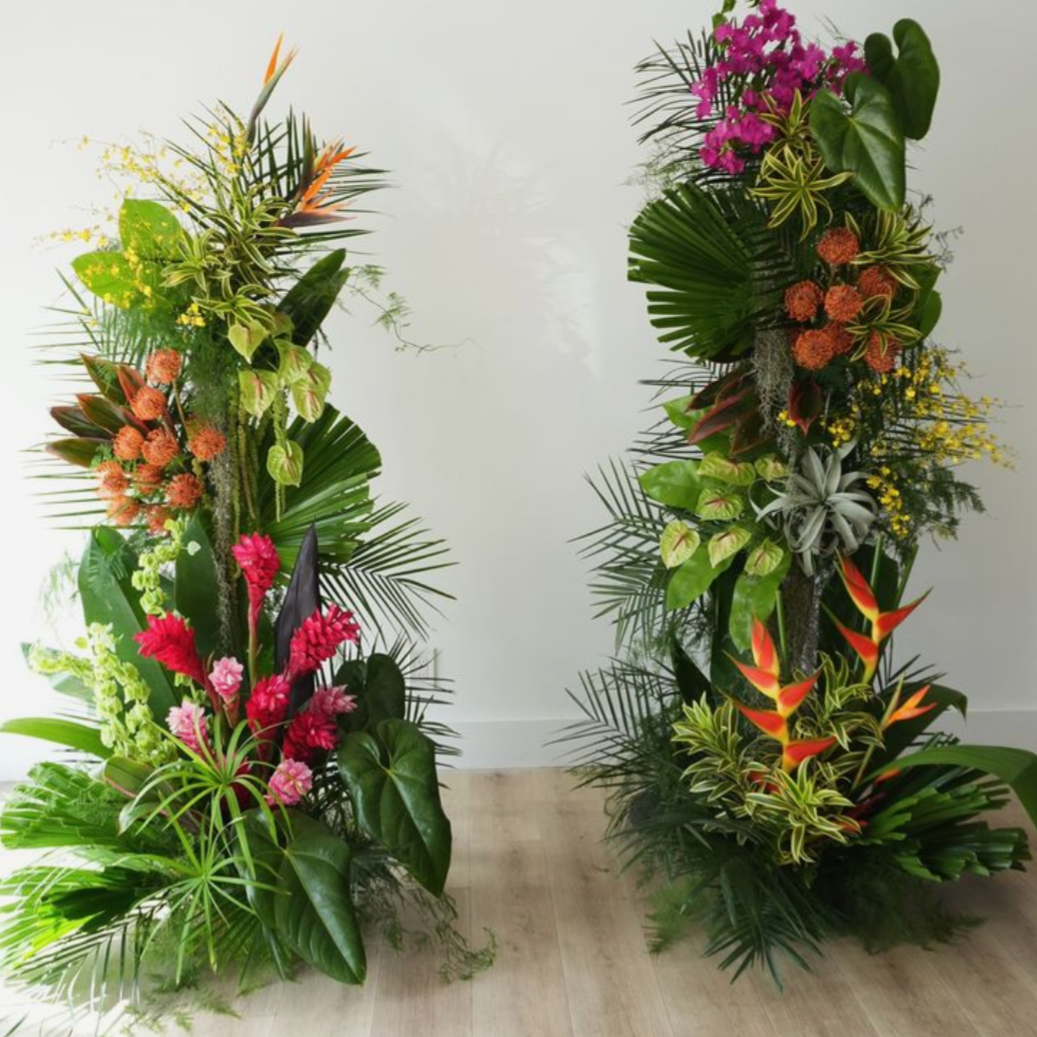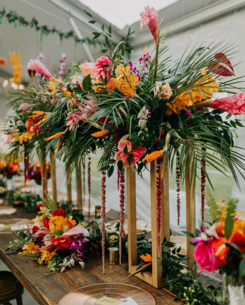 Hot and bright! Tropical vibes, tropical foliage, trees, flowers. Oranges and Pinks go gorgeously with this styling option. Think faux fruit, monstera leaves and trees